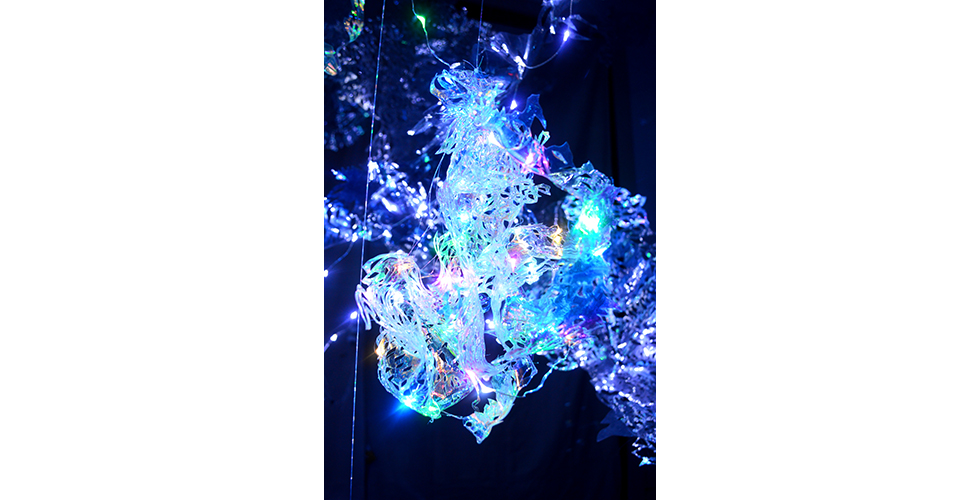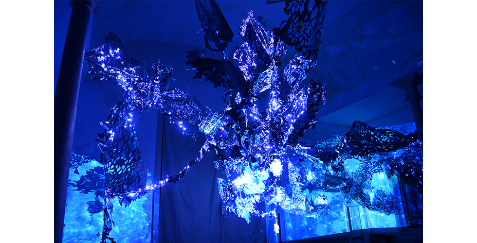 hand cut mylar, laser cut mylar, acrylic, vinyl, resin, pigments, LED lights, 3 channel projected video