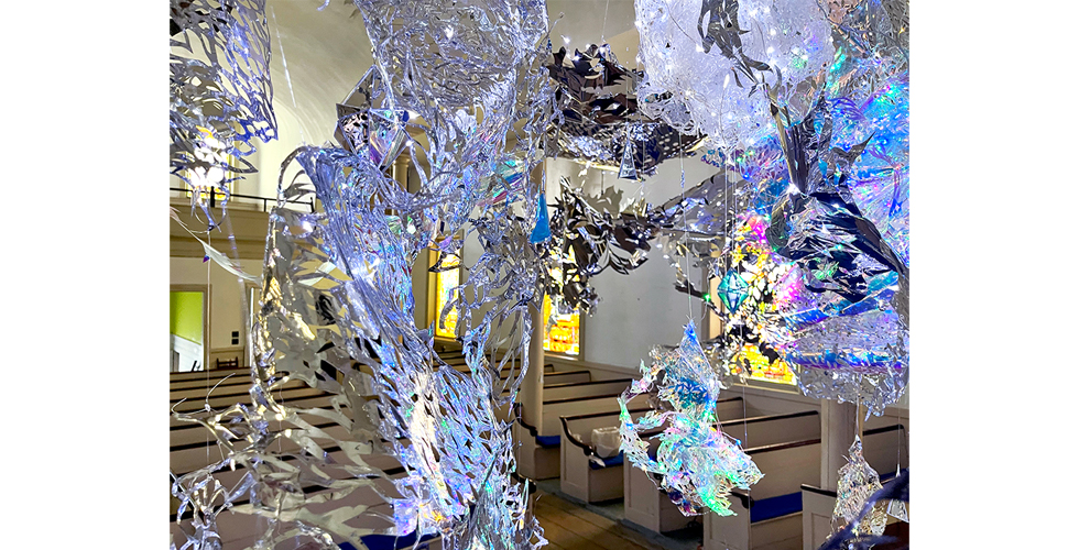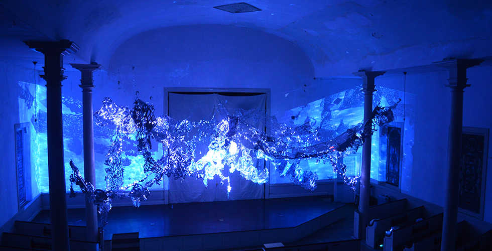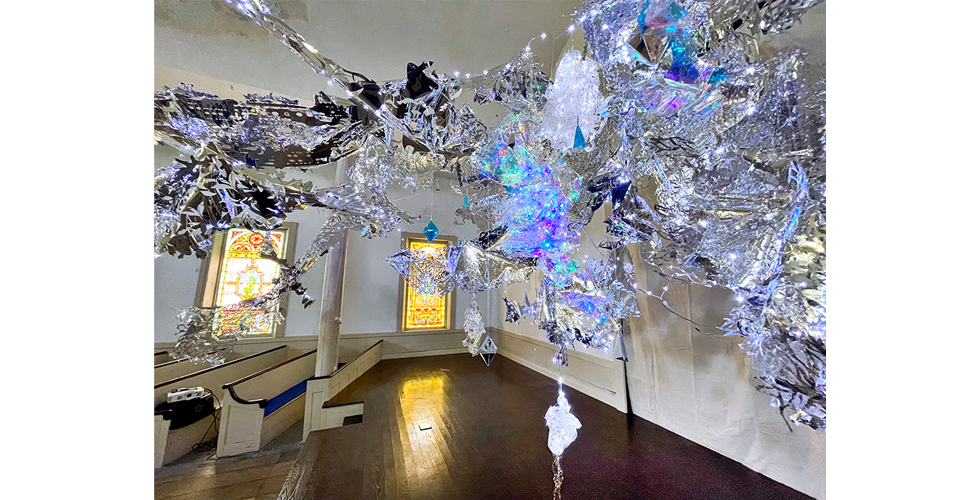 Three month suspended light sculpture and exhibition based on my “Crystal Fragments” series. Commissioned by The Tides Institute and Museum of Art for their North Church Space in Eastport, Maine. 33ft x 25ft x 12ft. The show opened with my music, movement and light art performance as "The Oracle."