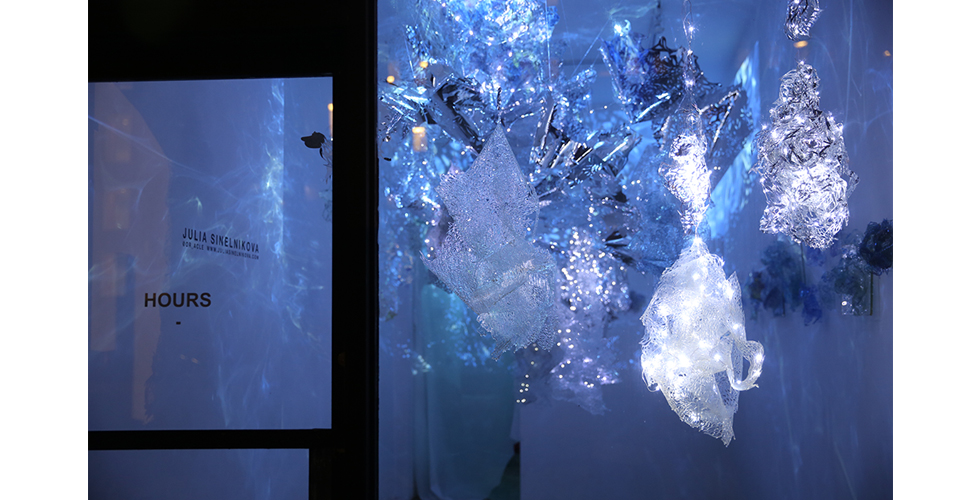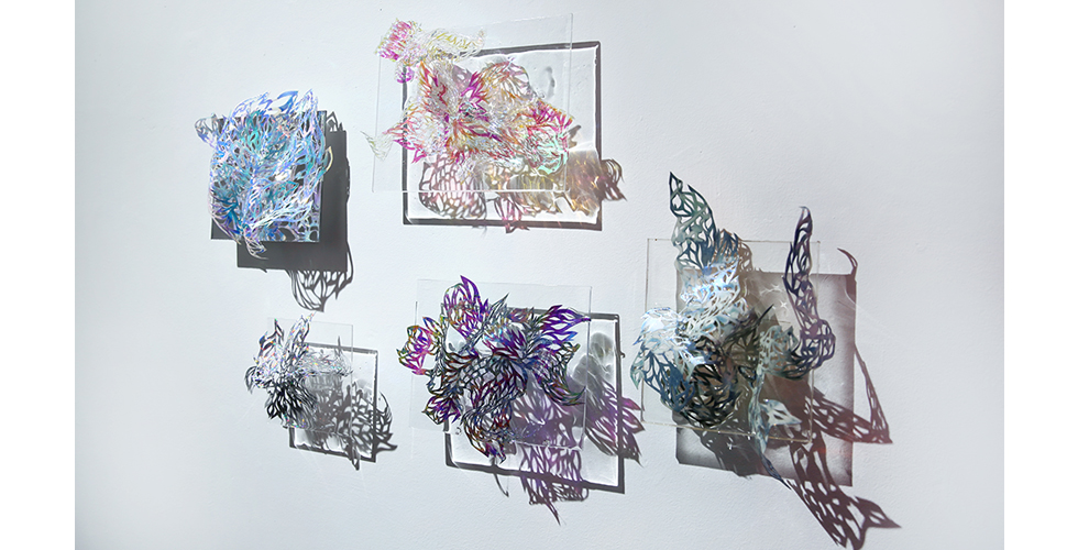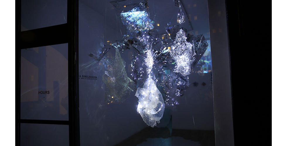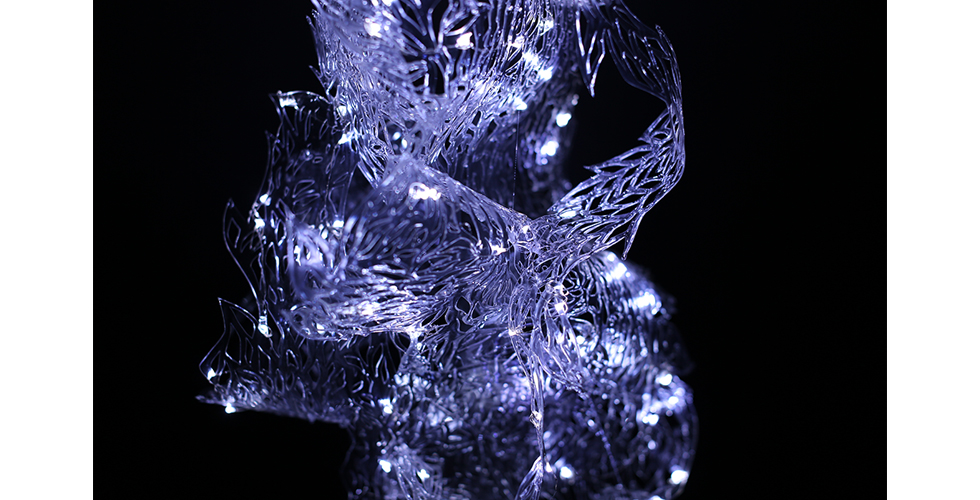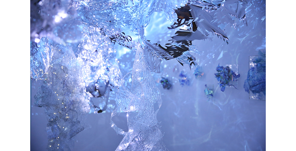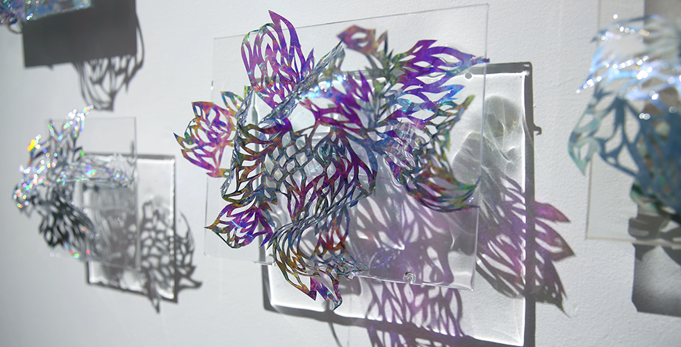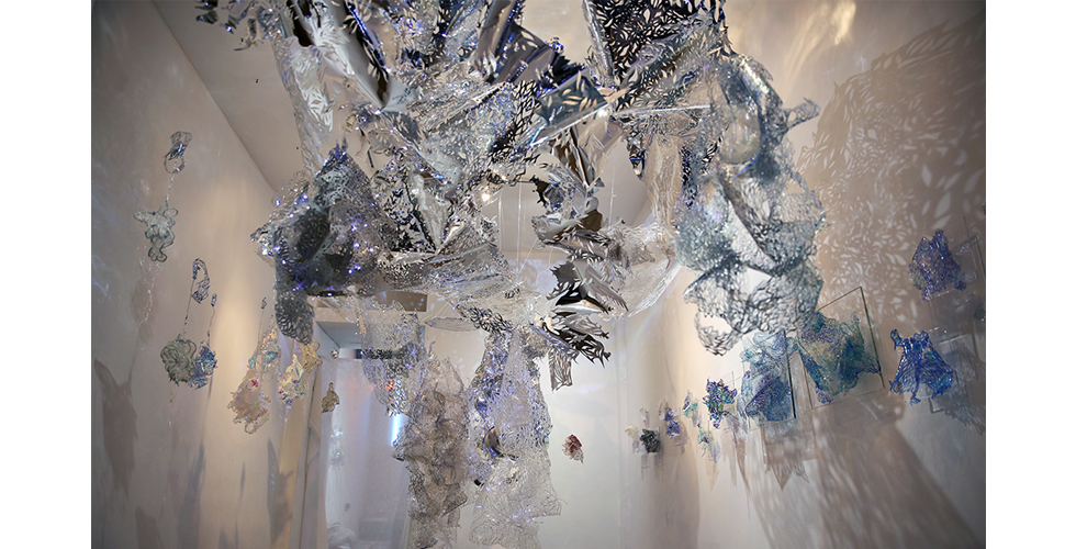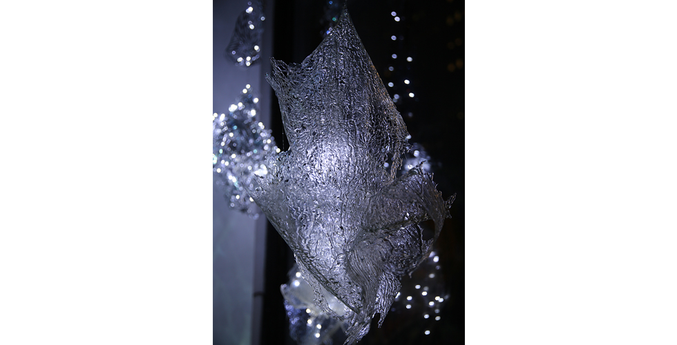 Inspired by the myth of the Fairies, beautiful and mercurial, as well as by the highly interchangeable nature of the contemporary digital persona, these modular works represent a realm of dangerous beauty. The light refractions within the installations create an infnite, mirrored space for the viewer to slip into self-refection.